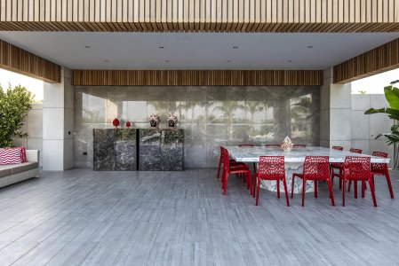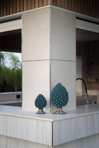 Tout le projet, achevé en 2021, est néanmoins en évolution perpétuelle. Pas que les espaces, mais aussi les meubles. L'extérieur est embelli par des buffets, réalisés avec les dalles de la collection Boutique dans la tonalité Noisette et peints en couleur moutarde brillant à l'intérieur, qui seront bientôt rejoints par des canapés, par des sièges et par une table dans l'élégante solution Calacatta Oro.