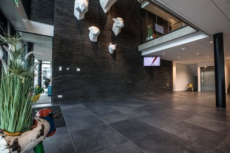 I pavimenti e i rivestimenti di tutta la sede sono realizzati con la collezione ALCHIMIA di Ceramica del Conca. Metallo, stonalizzato ed ossidato. È Alchimia, la superficie in gres porcellanato, dall’aspetto volutamente usurato ma stabile nel tempo, che grazie al grande formato e alla quasi assenza di fughe ricrea il mood irresistibile dei vecchi stabilimenti in disuso. Il tipico sapore industriale, la bellezza malinconica degli edifici abbandonati è una tendenza tutta da sperimentare in casa propria ma anche negli spazi commerciali e le quattro varianti di colore, insieme all’assortimento di formati, dal più grande 120x120 al più piccolo 40x80, agevolano utilizzo di questa collezione. (Distributor: Regge tegels & vloeren B.V. Vonderweg 25 7468 DC Enter)