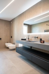 Lo stesso pavimento, Timeline colore taupe, prosegue in tutta la casa e nel bagno principale, quello con la vasca da bagno, le lastre 120x260cm sono utilizzate per rivestire le pareti.