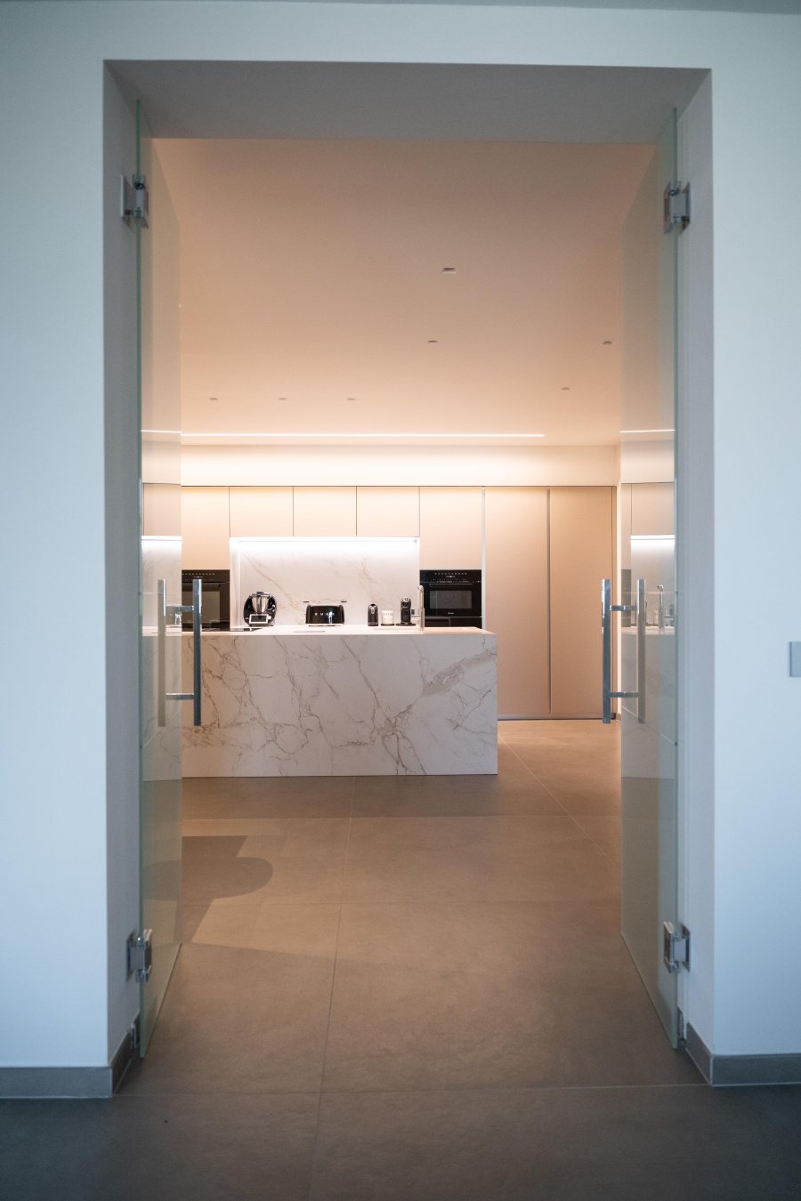 La zona cucina, divisa dal living da una porta vetrata a due ante, è stata pavimentata con la collezione di piastrelle in grande formato 120x120cm effetto cemento Timeline. Al centro della stanza un bancone funzionale con lavabo e fuochi rivestito completamente dalle lastre effetto marmo della collezione Boutique Calacatta Oro che ritroviamo anche nella zona doccia di un bagno.